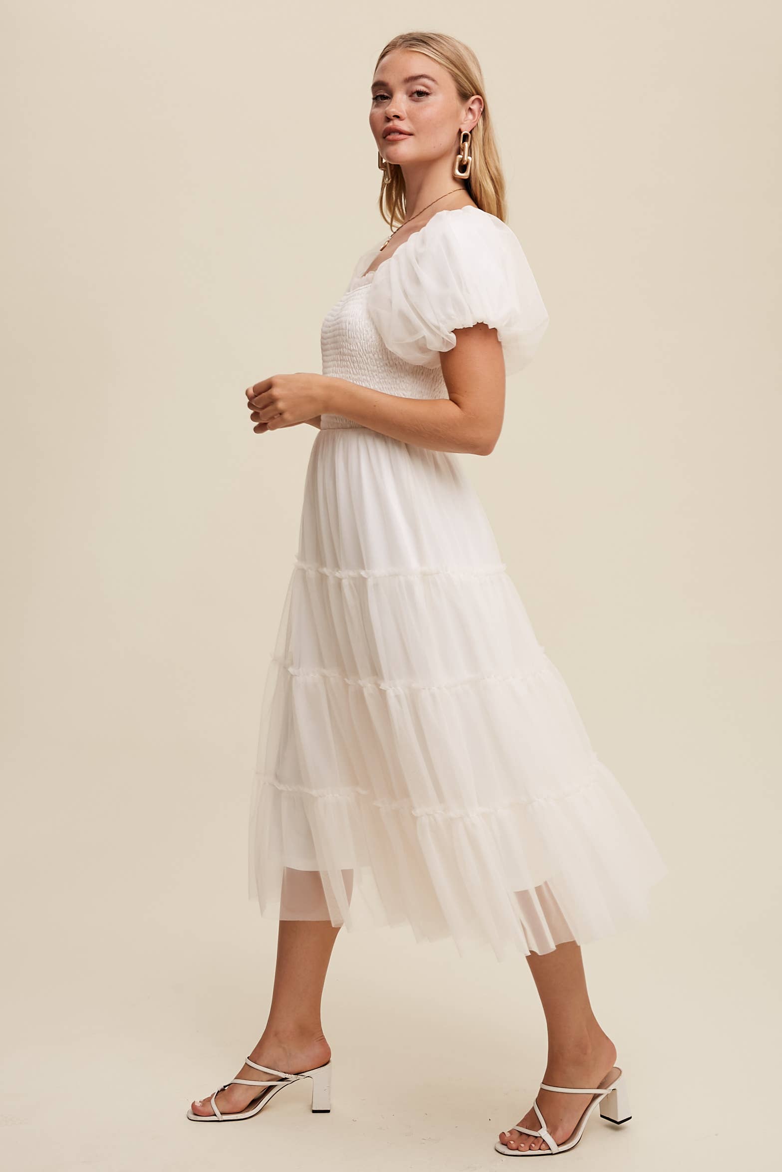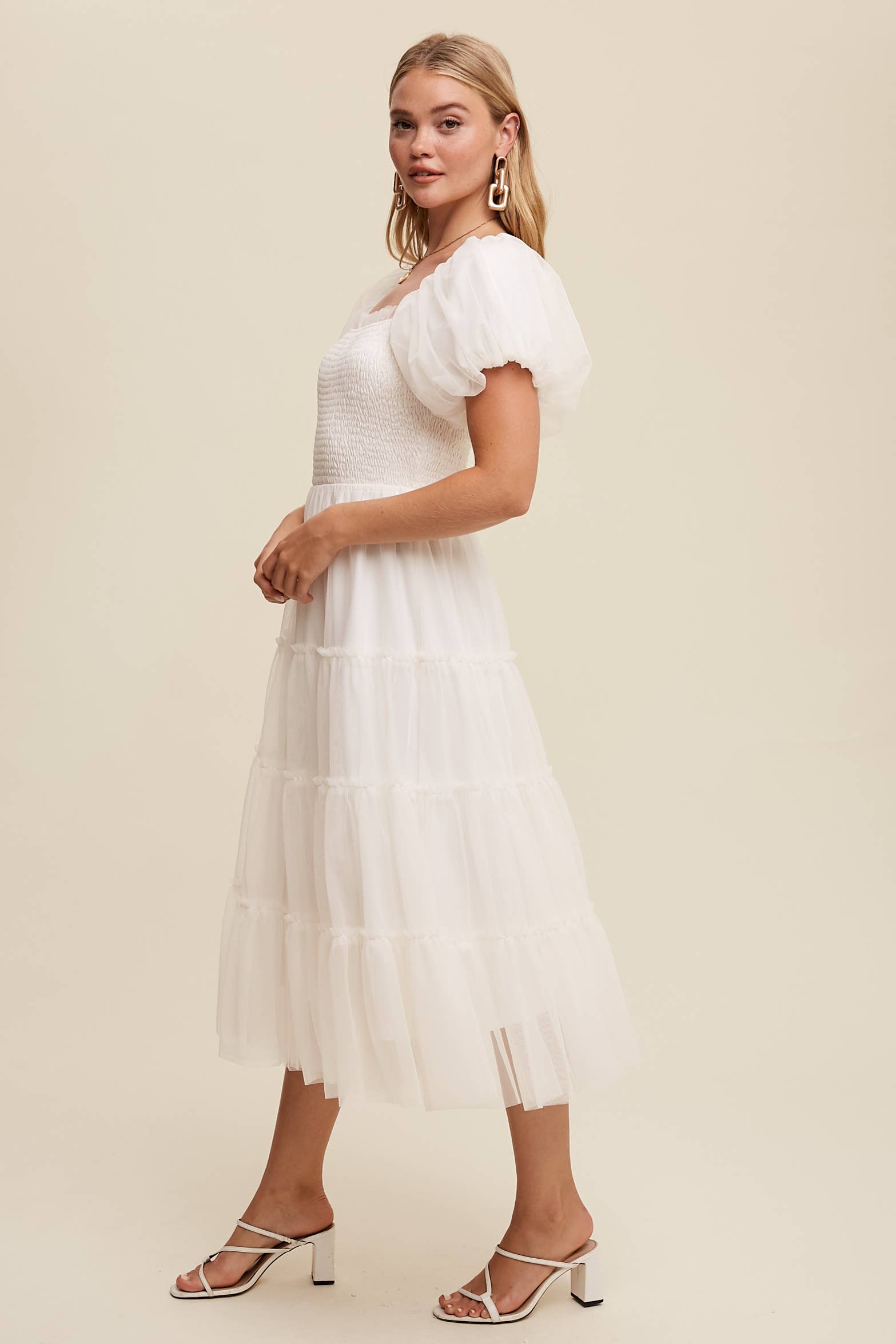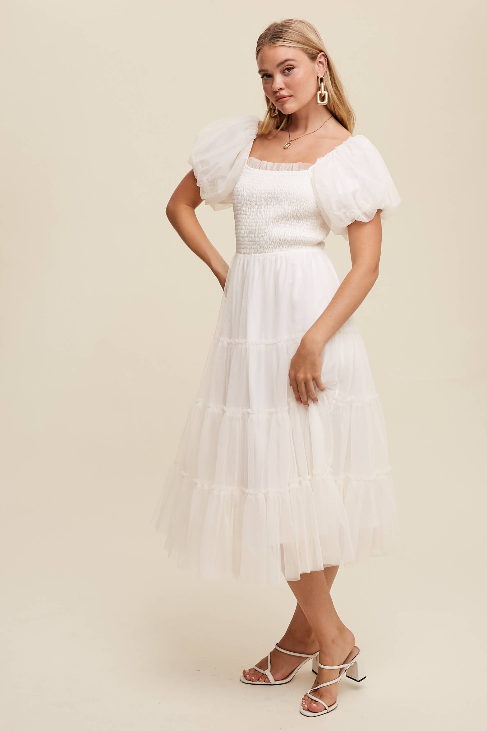 Square Neckline: Offers a graceful, structured frame for the collarbone - Puff Sleeves: Voluminous sheer sleeves create a dreamy, romantic shape!